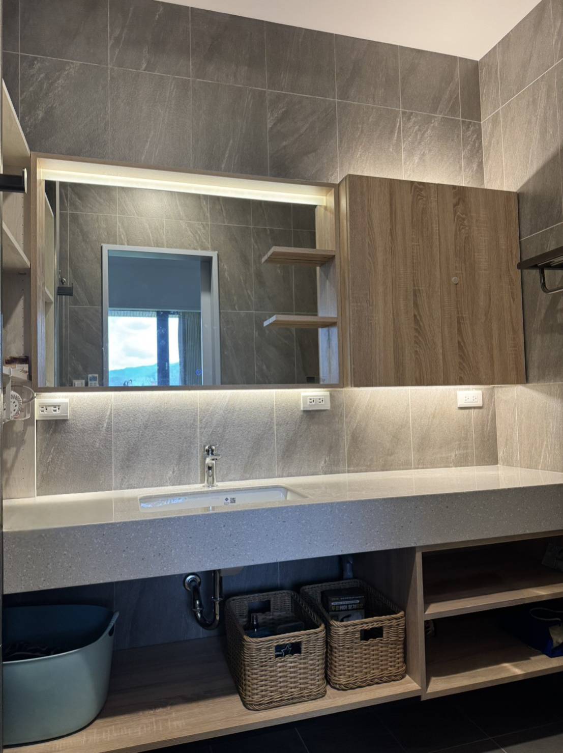 整體以灰色石紋磁磚為主調,呈現沉穩的現代感。鏡面周圍的間接燈光讓空間更柔和、乾淨,下方的開放空間擺上編織置物籃也帶出飯店式的質感。