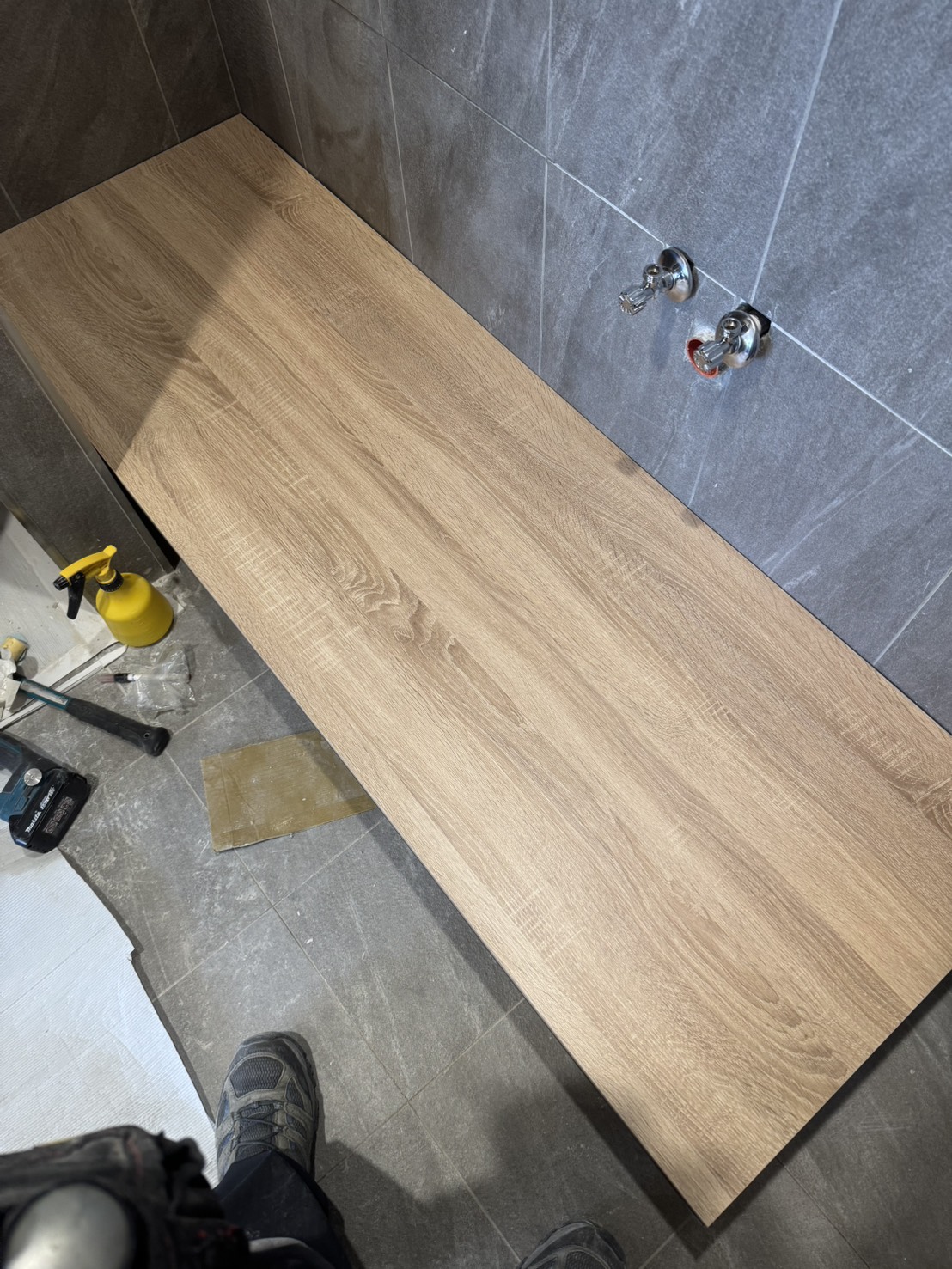 而木紋浴櫃的搭配則替這個冷調空間增添了剛好的溫度。灰色與木色的對比讓層次更明顯,視覺上既有質感又不會過於冰冷。自然木紋讓盥洗區看起來更放鬆、更生活化,營造出舒適又帶有質感的氛圍。