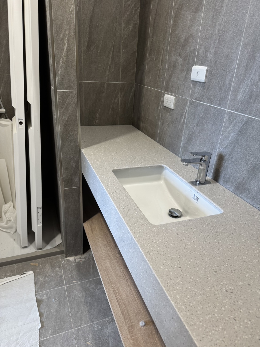 盥洗檯面選用了 LG 人造石 VA01,細緻的質地與沉穩灰調完美呼應整體空間。搭配 KOHLER K-2215 下嵌盆,讓檯面視覺更俐落、清潔也更便利;龍頭則採用 YATIN 8.25.011 鉻色龍頭,線條簡潔、耐用度高,在細節處展現質感。