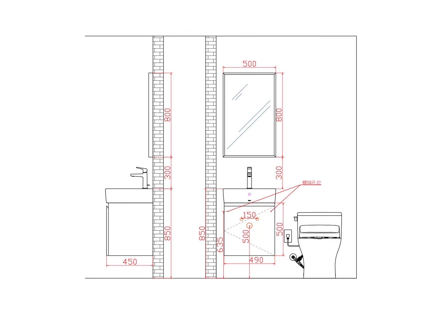 由於浴室整體空間坪數不大,在盥洗區的配置上以「保留動線與使用舒適度」為優先考量。因此在面盆與浴櫃的規劃上,將盥洗區寬度控制在 50 公分的尺寸,既能滿足日常洗手與盥洗需求,也能讓整體空間保有適當的通行動線。