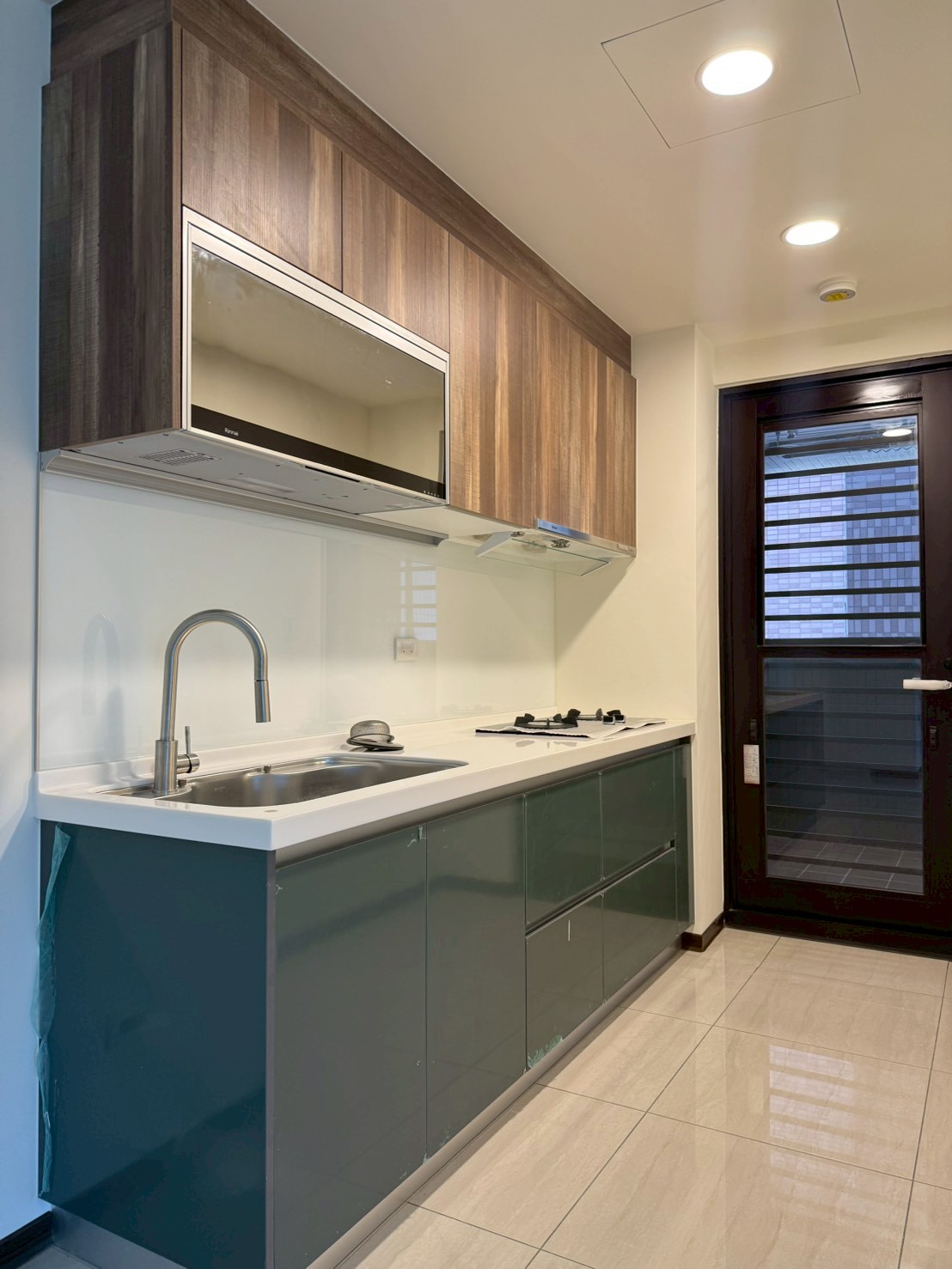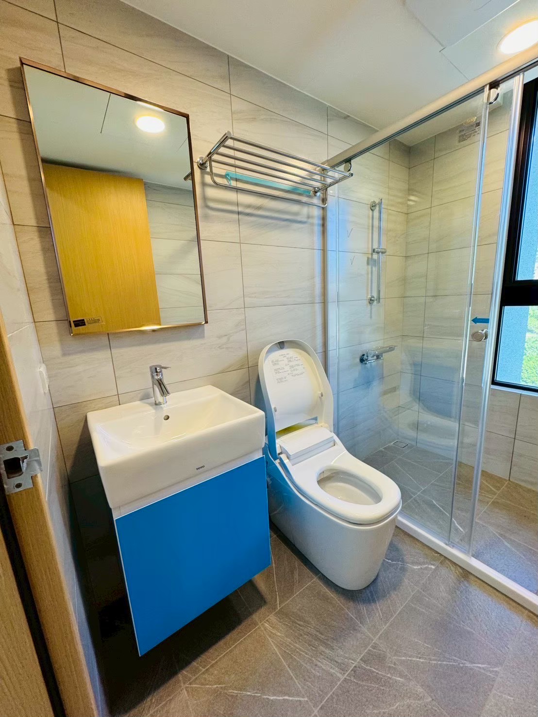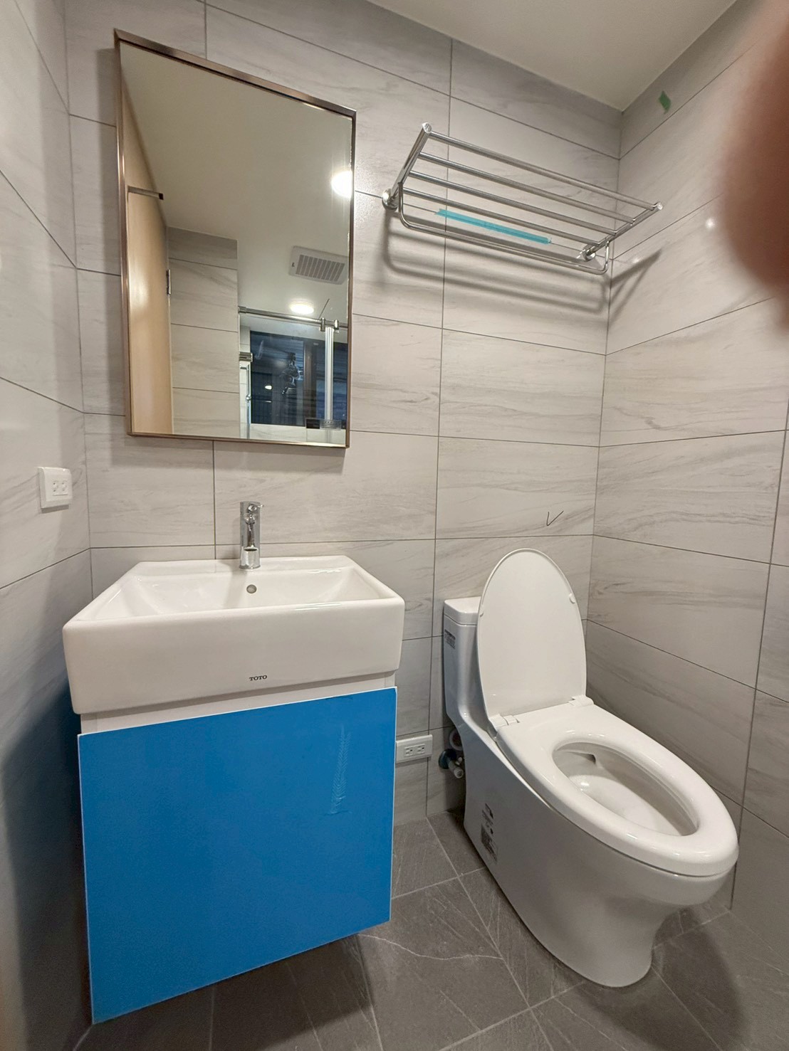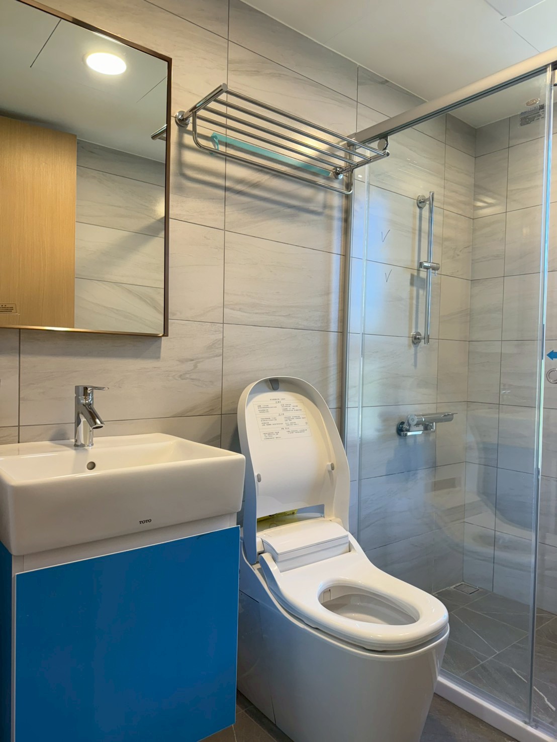浴室完工後整體以淺灰色磁磚搭配簡潔俐落的設備,讓小坪數空間也能維持清爽明亮的視覺感。照片中可以看到浴櫃門片仍貼有保護膜,主要是因為門片採用結晶鋼烤白,在交屋前為避免施工或清潔過程造成刮傷,因此暫時保留保護膜,待交屋前再由屋主撕除。