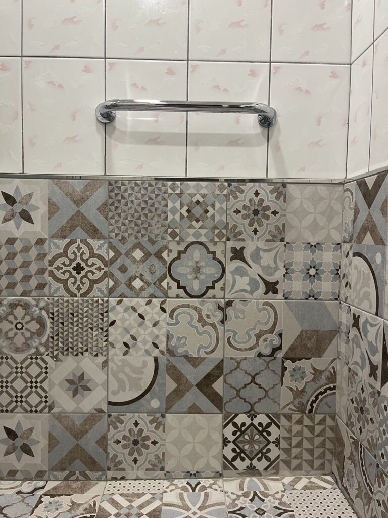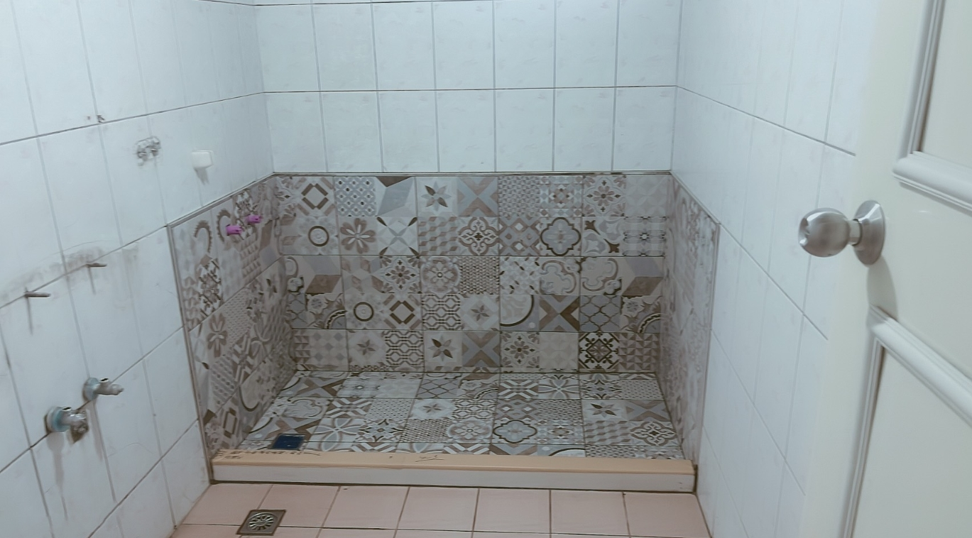 業主知道因為只做局部拆換,磁磚一定不可能一樣;既然會不一樣~要跳色就給它又花又跳,所以特意去挑選了花磚。花磚的點綴為整體空間注入了活力,提升了浴室的視覺層次感,讓空間更加有趣且充滿個性,原來純白色的磁磚就不再顯得過於單調!而且業主說這款磚表面算粗粗的,也是適合當地板的磚。