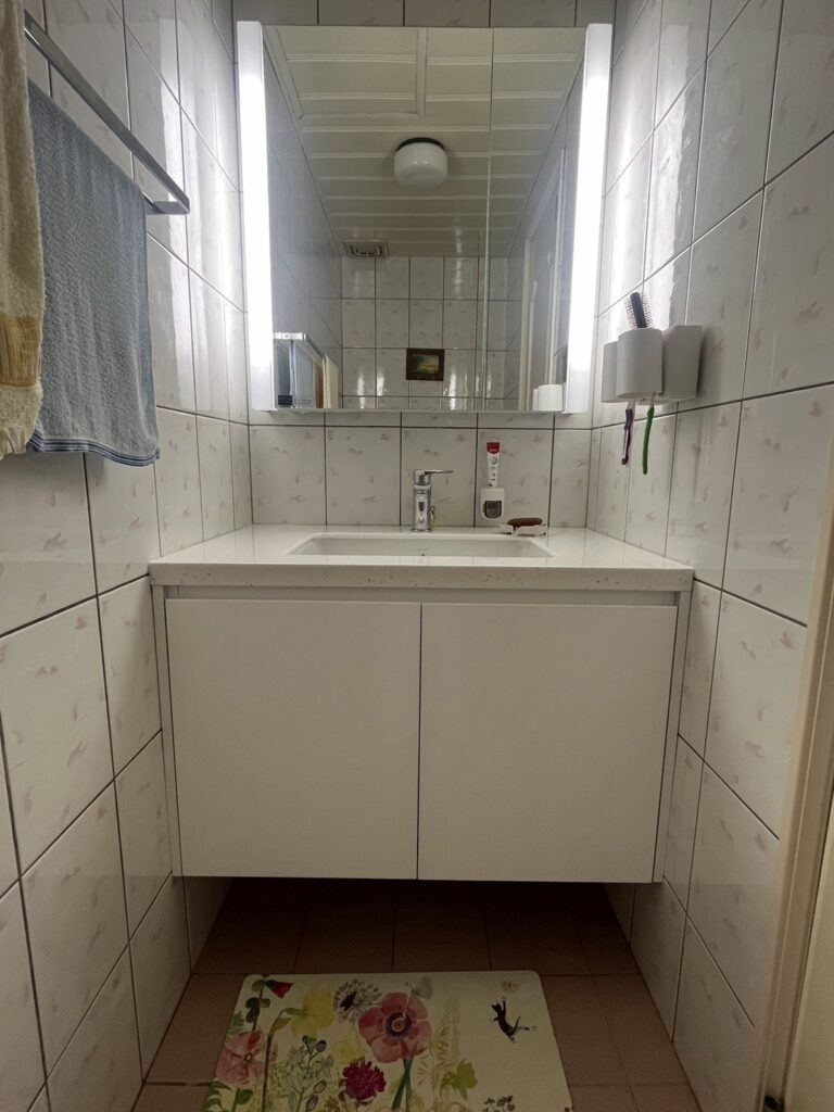 首先主浴的鏡子與檯面重新設計,將舊有的單一鏡子換成了帶有燈光的訂製鏡櫃,搭配新的檯面收納浴櫃,整體顯得更整潔、明亮。