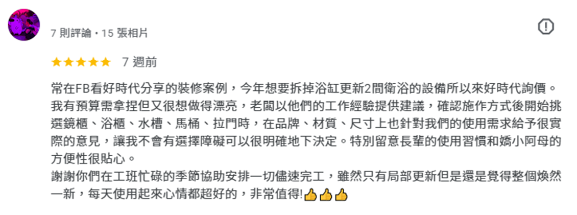 最後我們也非常感謝業主主動在Google評論上給予我們大大的好評與推薦!💗 能夠讓顧客在使用改造後的浴室時感受到舒適與愉悅,是我們最大的成就。每一次的細節調整,都是為了提升使用者的生活品質,能夠讓顧客心情愉快地使用我們的設計,對我們來說是無比珍貴的肯定!