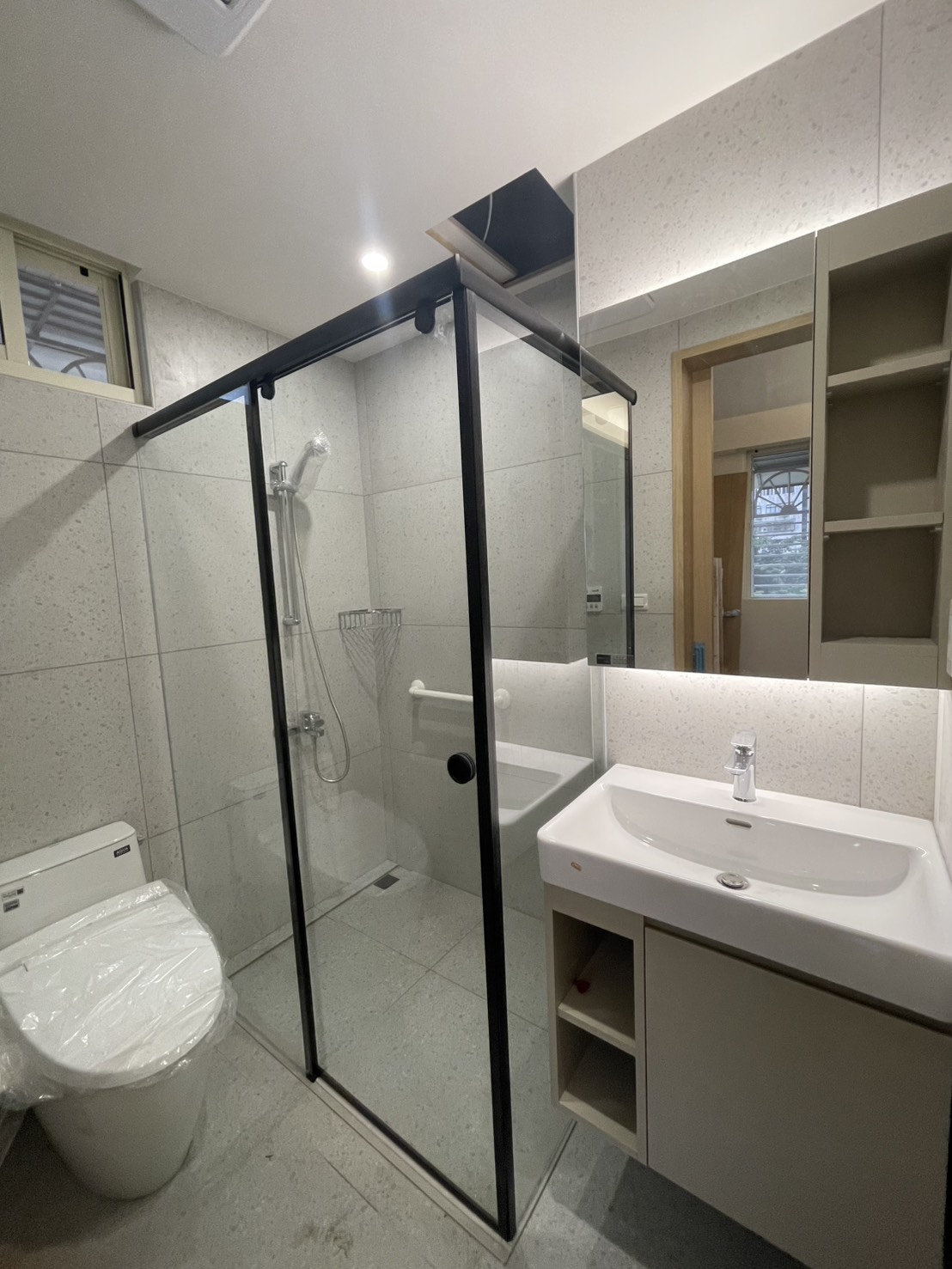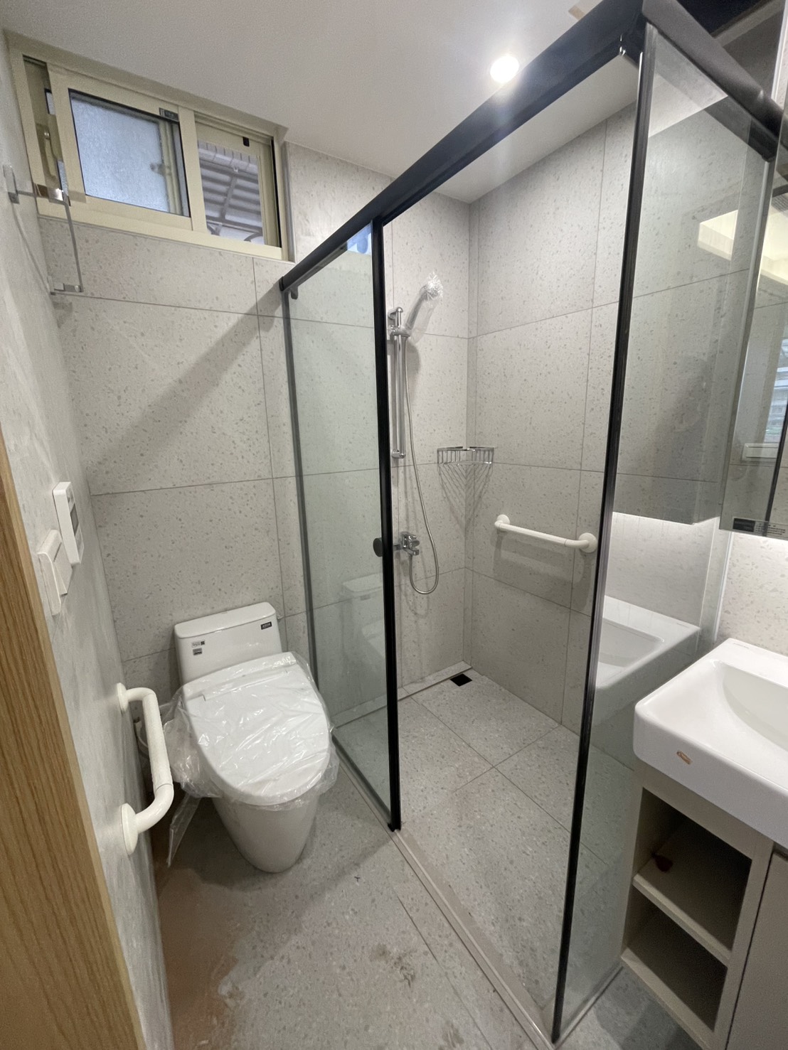 可以看得出來浴室本身空間不大,但透過清楚的乾濕分離與設備配置,機能依舊完整到位。淋浴區、馬桶與洗手檯各自保有基本空間,不顯擁擠,也不影響日常動線。