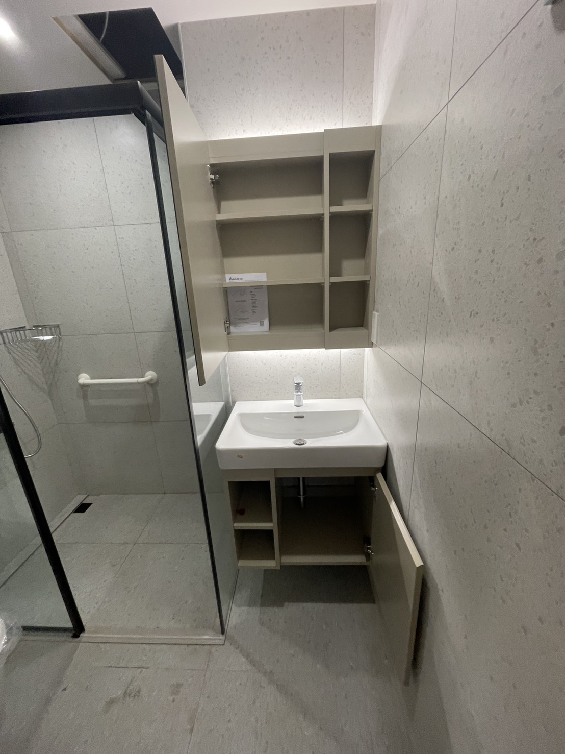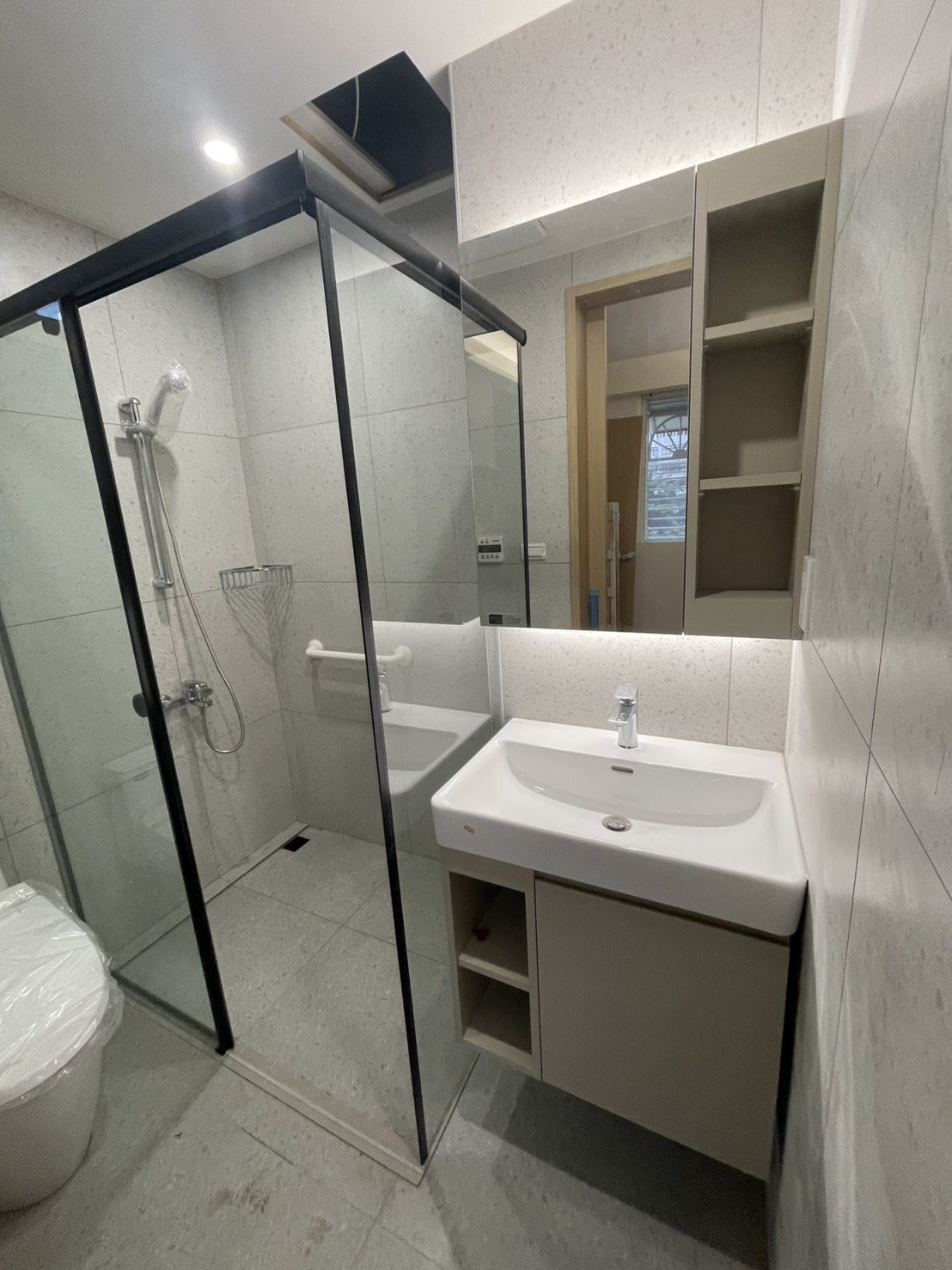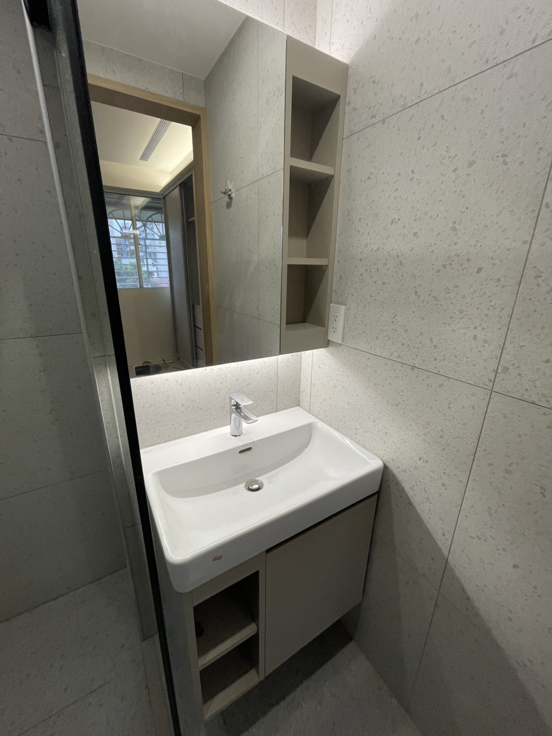 盥洗區則規劃為訂製奶茶色的側開放單門鏡櫃,考量右側緊鄰牆面、左側為淋浴拉門的空間條件,整體尺寸與開啟方向皆需精準拿捏。此外右側牆面設有插座,鏡櫃在設計上必須配合插座位置與深度調整,才能在不影響使用的前提下,嚴絲合縫地卡進牆面與插座的深度。
