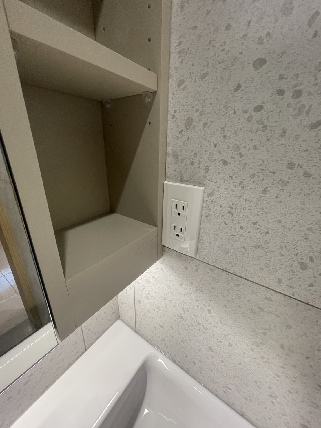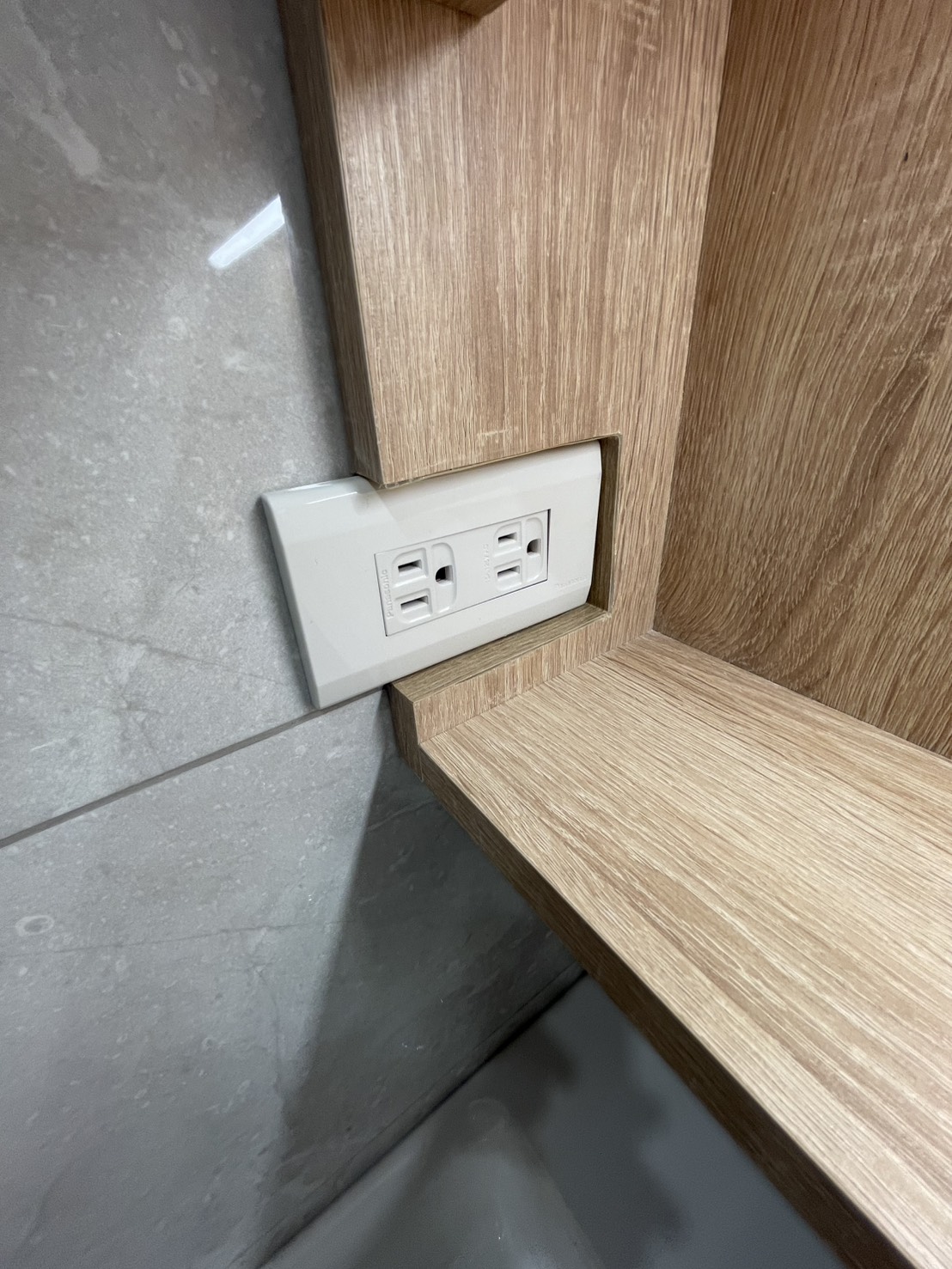 由於客浴牆面原配的插座位置會和鏡櫃深度衝突,因此設計在櫃體上做挖凹處理,讓插座能夠恰好嵌入櫃體之中,解決施工限制,也維持立面整潔與使用安全,展現好時代對細節精準拿捏的規劃思考!