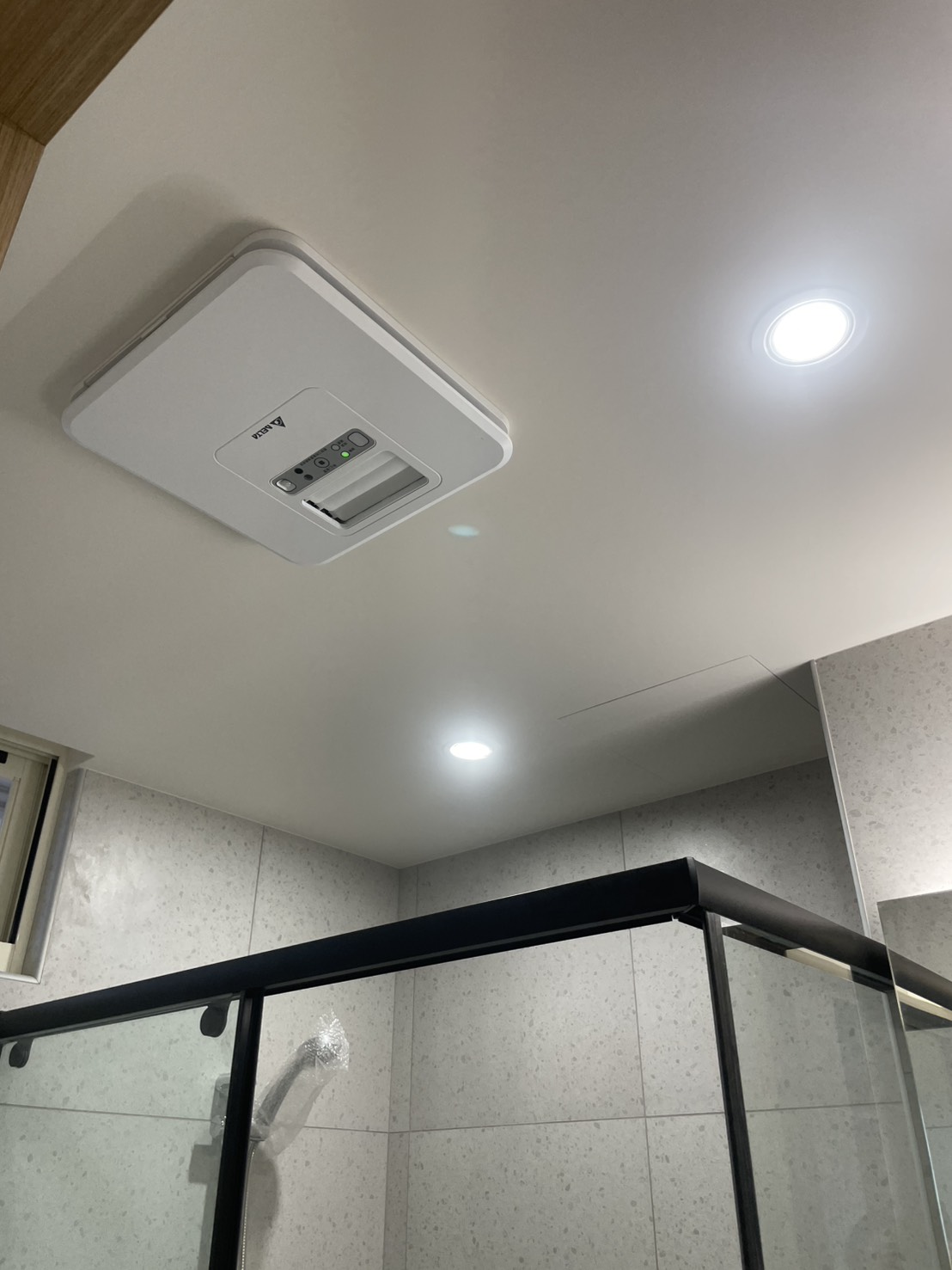 馬桶區以簡潔、好清潔與安全性為主要考量,配置 INAX AC912VN 單體馬桶,體積適中,適合小空間使用;搭配 INAX RL11TW 免治馬桶蓋,提升日常如廁的舒適度與便利性。牆面同樣設置 NY-2045 白色抗菌一字型扶手,方便起身與坐下;上方則搭配 YATIN 7.11.37 Corot 毛巾單桿 60cm。天花板則安裝TYB3151AAR 浴室換氣暖房乾燥機。