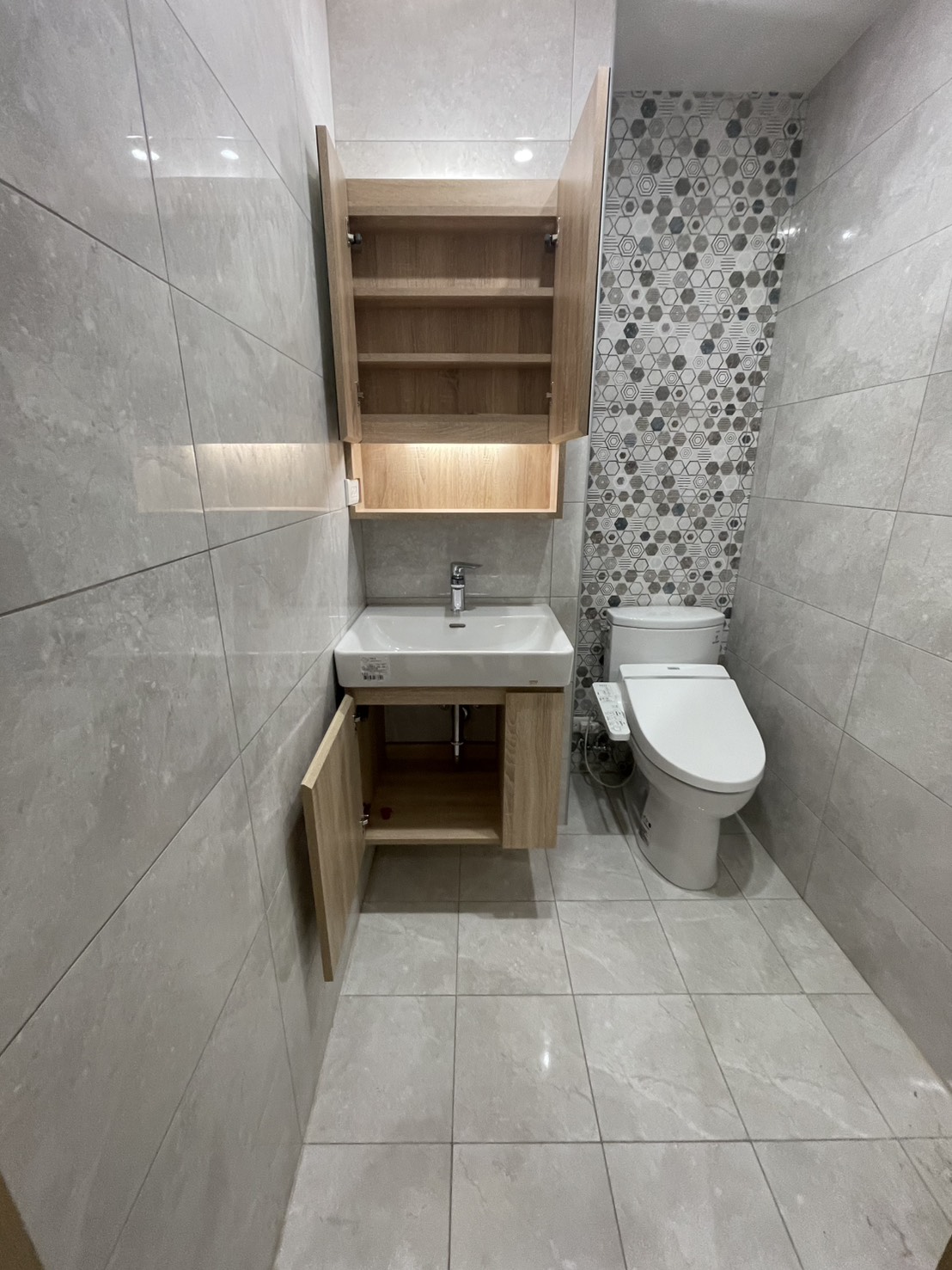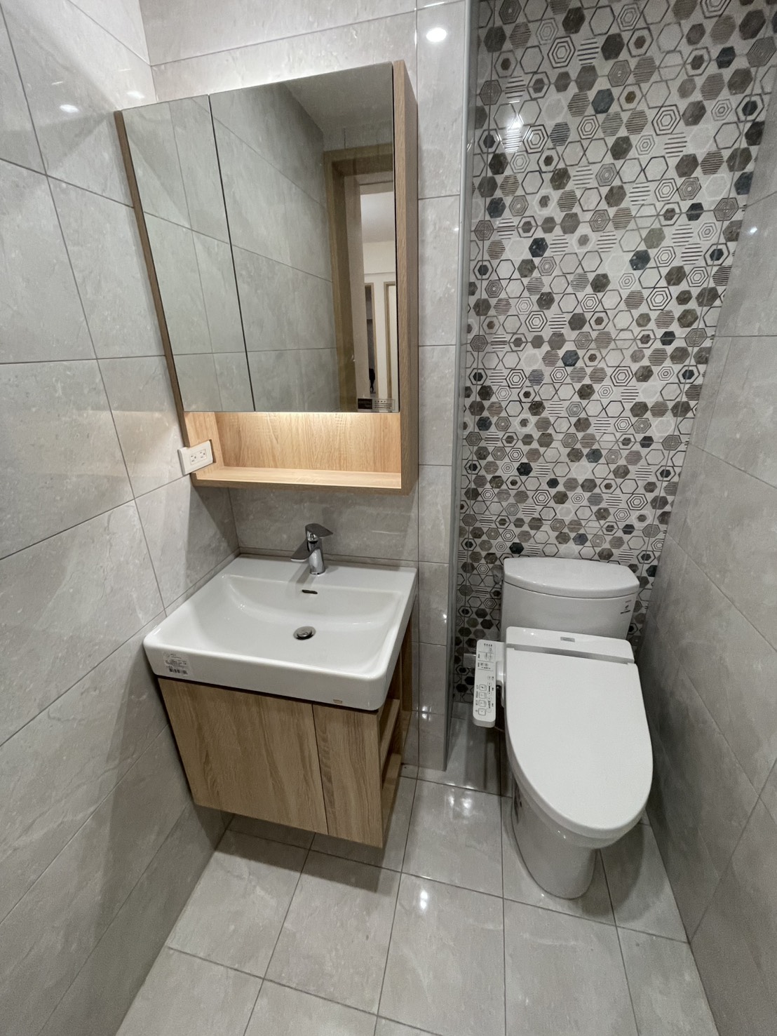 客浴整體以清爽明亮為主調,淺色磁磚搭配局部幾何花磚牆面,在低調中增加視覺層次,不顯單調。木紋浴櫃與鏡櫃的搭配為空間帶來溫潤氣息,平衡衛浴空間常見的冷調感受。
