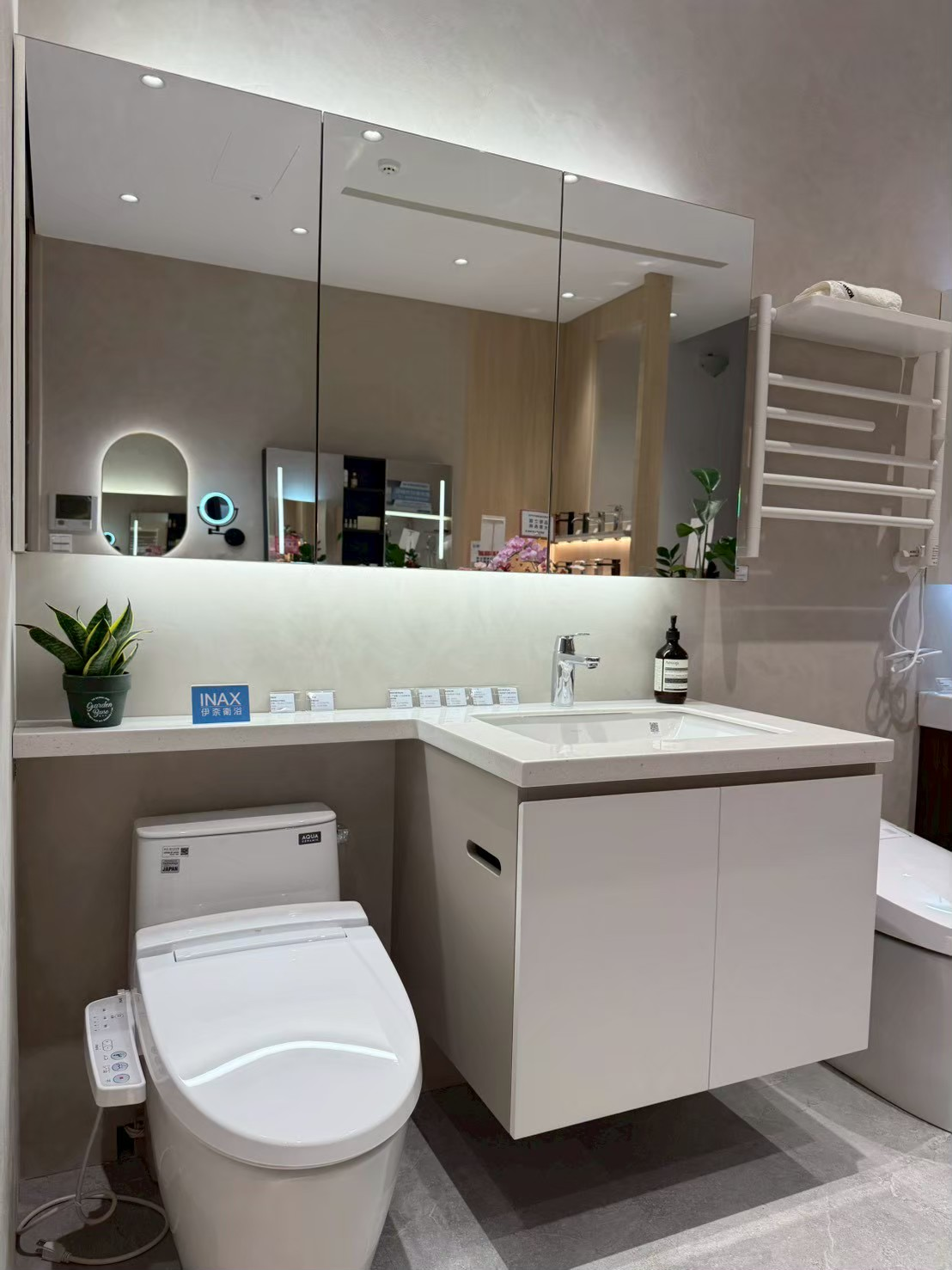 - 全櫃體門片為防水發泡板的材質,而使用的零件為Blum的吊掛器。