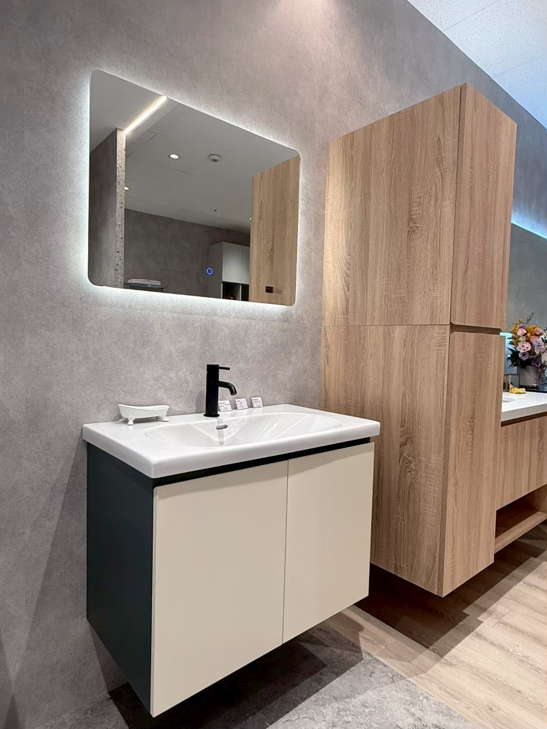 這款的訂製櫃體暗墨綠、門片為白梣木紋,採用雙門右側開放+紙巾孔訂製櫃。