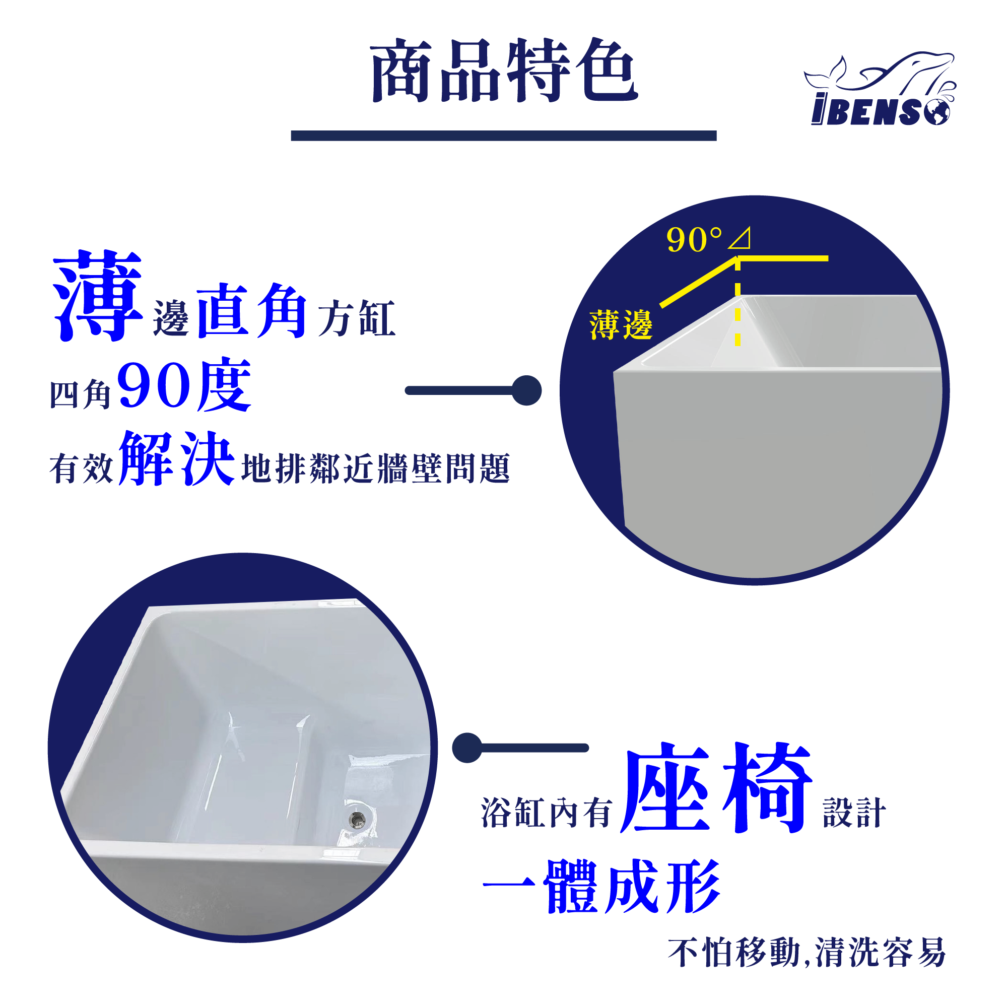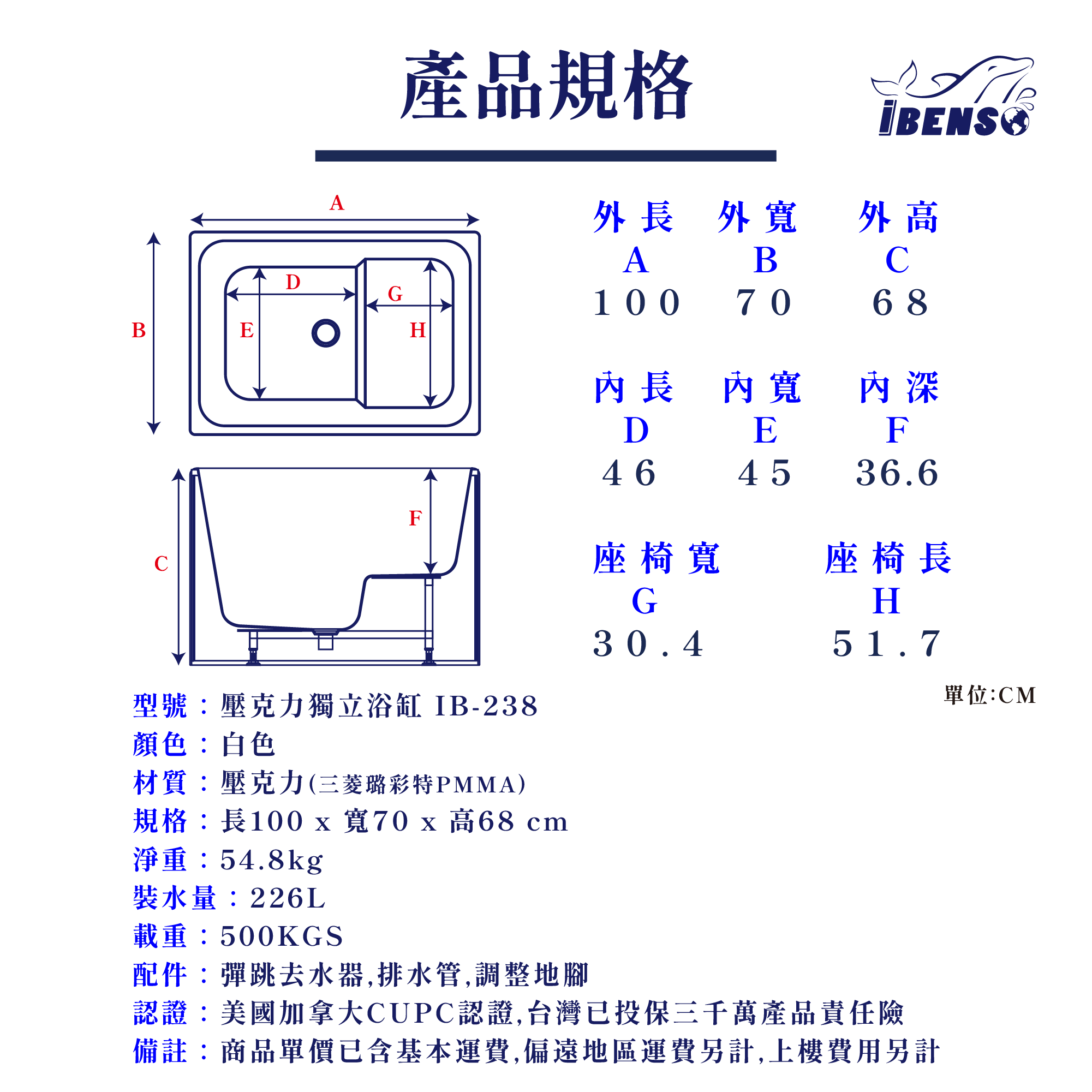 品名:IB-238 壓克力獨立浴缸 – 坐式浴缸(一體成形椅)